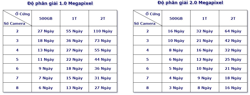 Bảng quy đổi Dung lượng ổ cứng trên số lượng camera (tham khảo dựa trên lý thuyết)